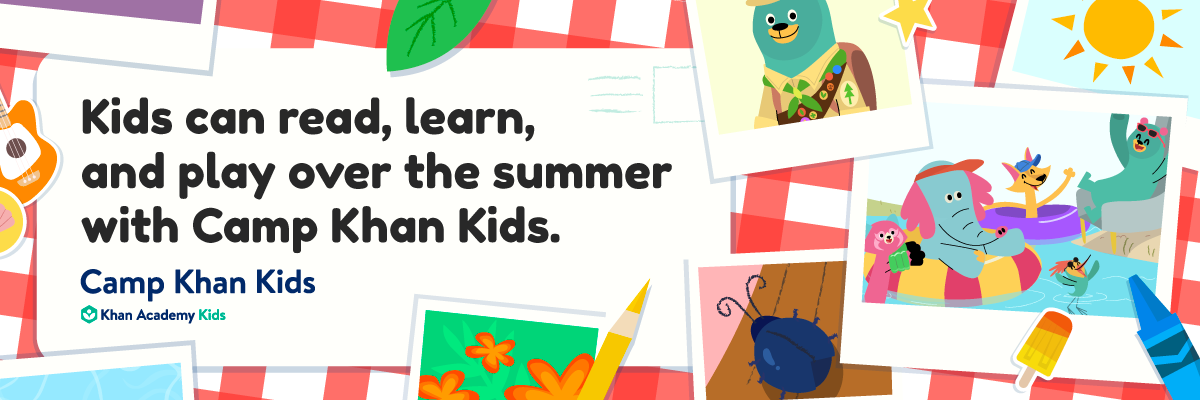 Join us in July for Camp Khan Kids, a free, self-paced summer learning program for children ages 2–8. The camp guides parents and children in a playful educational journey using Khan Academy Kids as a launchpad into hands-on learning. Use our camp schedules to mix and match activities to fit your family's needs at any time of day. We can't wait for you to read, play, and learn with Camp Khan Kids.