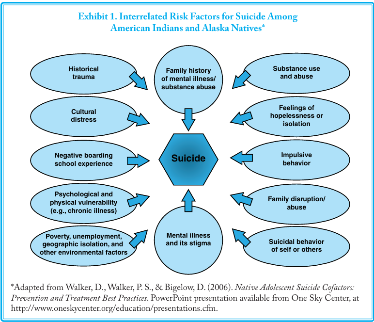 Suicide is complex, and there is no single reason, cause, or emotional state that directly leads to suicide. Substantial research has been conducted on suicidal behavior, risk factors, and trigger events in the general population, but research within AI/AN communities is comparatively limited. Exhibit 1 illustrates what current research into AI/AN suicide suggests are risk factors that place any individual at risk (e.g., mental illness and substance abuse) together with factors that are unique to AI/ANs (e.g., historical trauma).