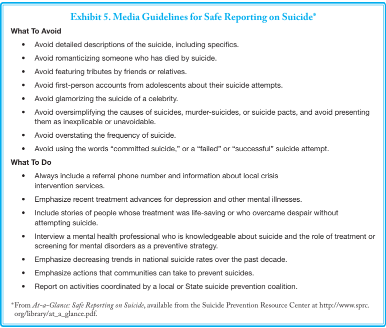 Exhibit 5 summarizes guidelines for responsible reporting that were developed in collaboration by the CDC, National Institute of Mental Health, Office of the Surgeon General, Substance Abuse and Mental Health Services Administration (SAMHSA), American Foundation for Suicide Prevention, American Association of Suicidology, and the Annenberg Public Policy Center. At the very least, State and local media outlets should be provided with these guidelines before a community shares any detailed information about a suicide with reporters. Appendix E: Web Site Resources and Bibliography lists additional publications that provide guidance for enlisting the media in prevention efforts and for reporting on suicide.