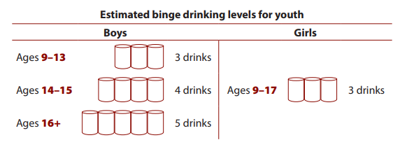 Compared with adults, children and teens are likely to have higher blood alcohol concentrations after drinking similar amounts of alcohol. Because we ethically cannot conduct clinical studies of youth drinking, we rely on mathematically derived estimates of blood alcohol levels for youth. Extrapolating from what is known about alcohol metabolism in adults, a recent study accounted for differences between adults and kids in body composition and alcohol elimination to estimate blood alcohol and binge levels for youth. The study concluded that binge drinking for youth should be defined as follows (Donovan, 2009):