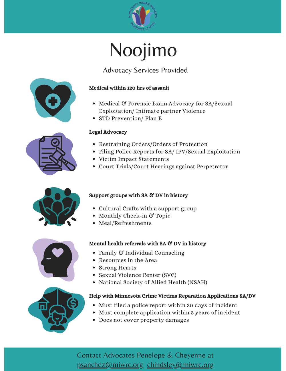 Providing crisis intervention, individual and group counseling, forensic examination support, and court advocacy for American Indian survivors of sexual violence, including individuals incarcerated at the Hennepin County Adult Correctional Facility (ACF) and the Federal Correctional Institute: Waseca, MN.