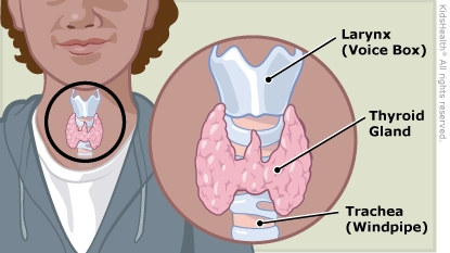The thyroid is a small gland below the skin and muscles at the front of the neck, at the spot where a bow tie would rest.