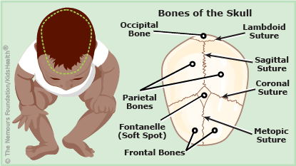 Babies' skulls are made of several bones that fit together like a puzzle. At birth, the borders between the bones (called cranial sutures) are not yet solid. This lets the skull expand, leaving the "soft spot" or (fontanelle).